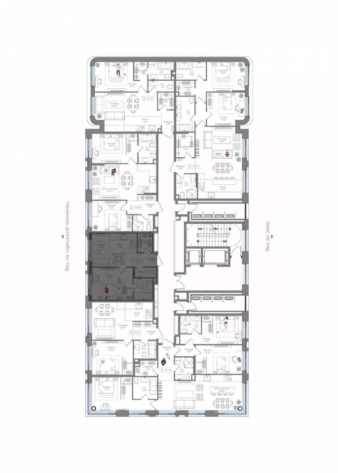 Внутренний двор 1,5 га функциональное и безопасное пространство для игр, работы и занятий спортом. Пешеходный променад для прогулок. Дома переменной этажности. Есть подземный паркинг.