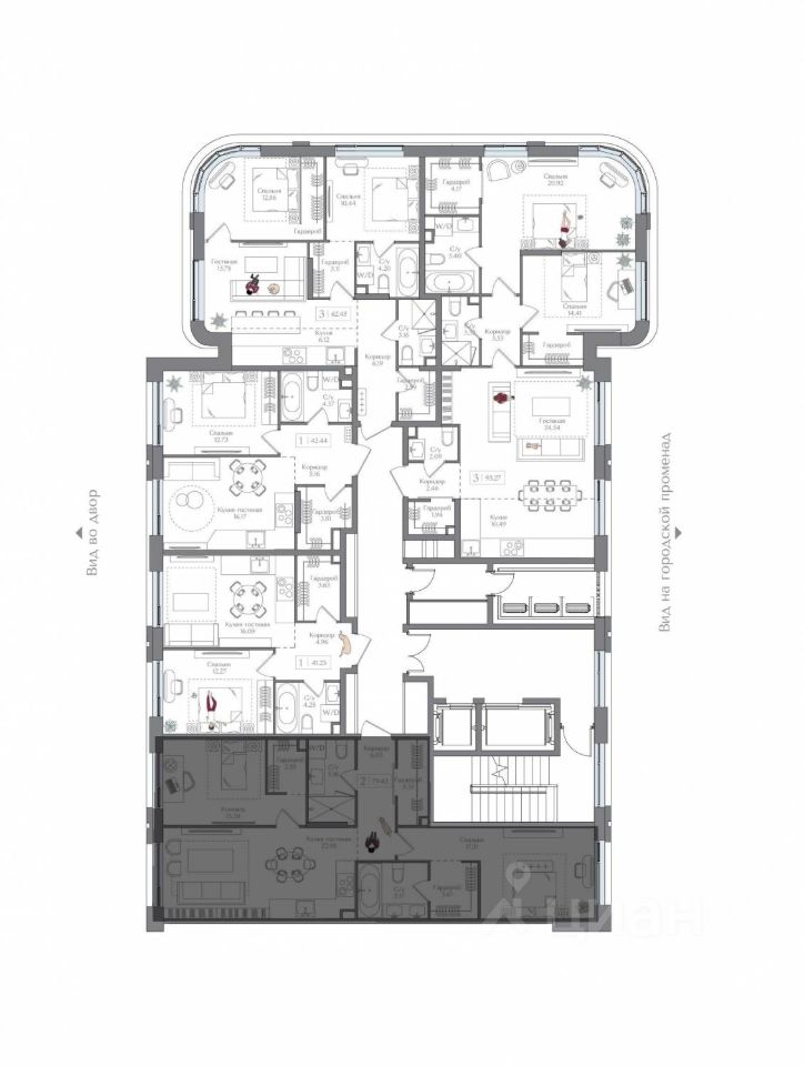 Внутренний двор 1,5 га функциональное и безопасное пространство для игр, работы и занятий спортом. Пешеходный променад для прогулок. Дома переменной этажности. Есть подземный паркинг.