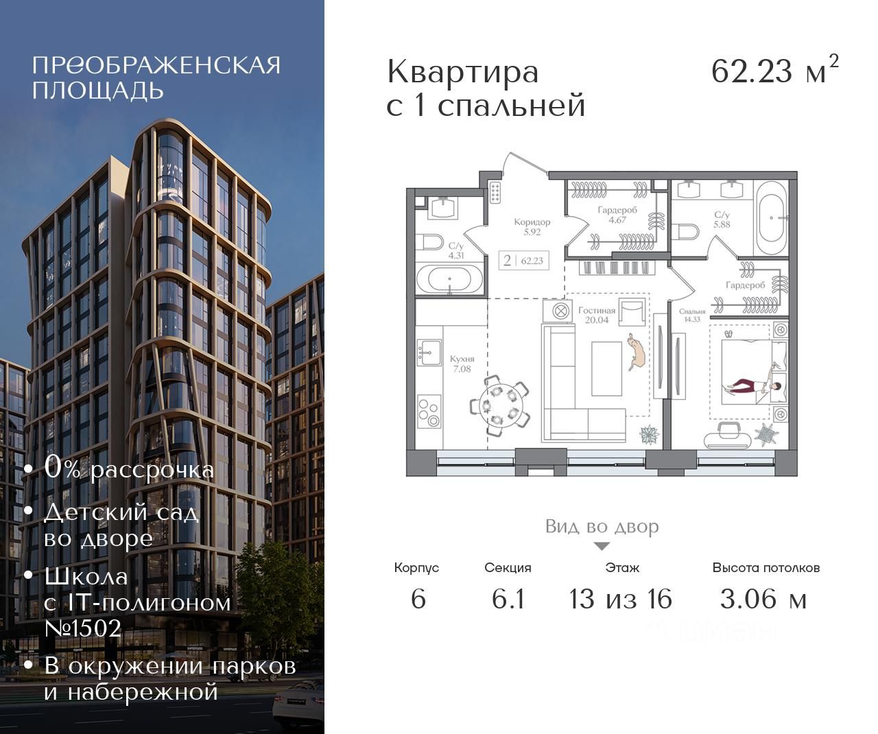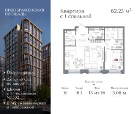 Квартира на 13 этаже в жилом комплексе премиум-класса "Преображенская площадь". Общая площадь: 62.23 кв.м.