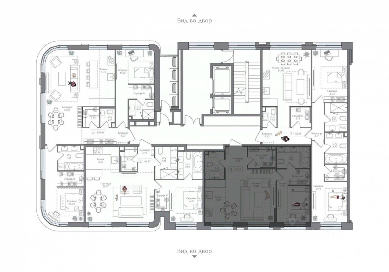 Внутренний двор 1,5 га функциональное и безопасное пространство для игр, работы и занятий спортом. Пешеходный променад для прогулок. Дома переменной этажности. Есть подземный паркинг.