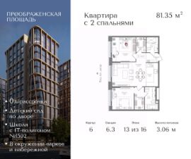 Квартира на 13 этаже в жилом комплексе премиум-класса "Преображенская площадь". Общая площадь: 81.35 кв.м.