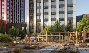 Вся площадь двора-парка будет огорожена и составит более 2 га, из которых 45% - озеленение. Одним из самых важных ландшафтных элементов здесь станет небольшая речка, наполняющаяся во время дождя. Вокруг неё появится сеть из островов, внутри которых расположатся тематические зоны спорта и отдыха.