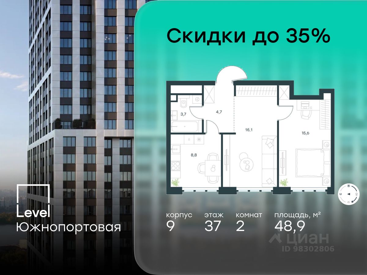 В северной части района Печатники продается 2-комнатная квартира площадью 48.90 кв.м с отделкой white box. Квартира расположена на 37 этаже 49-этажного корпуса 9 в жилом комплексе комфорт-класса Level Южнопортовая (компания Level Group/Левел групп).
