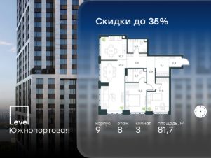 В северной части района Печатники продается 3-комнатная квартира площадью 81.70 кв.м с отделкой white box. Квартира расположена на 8 этаже 49-этажного корпуса 9 в жилом комплексе комфорт-класса Level Южнопортовая (компания Level Group/Левел групп).