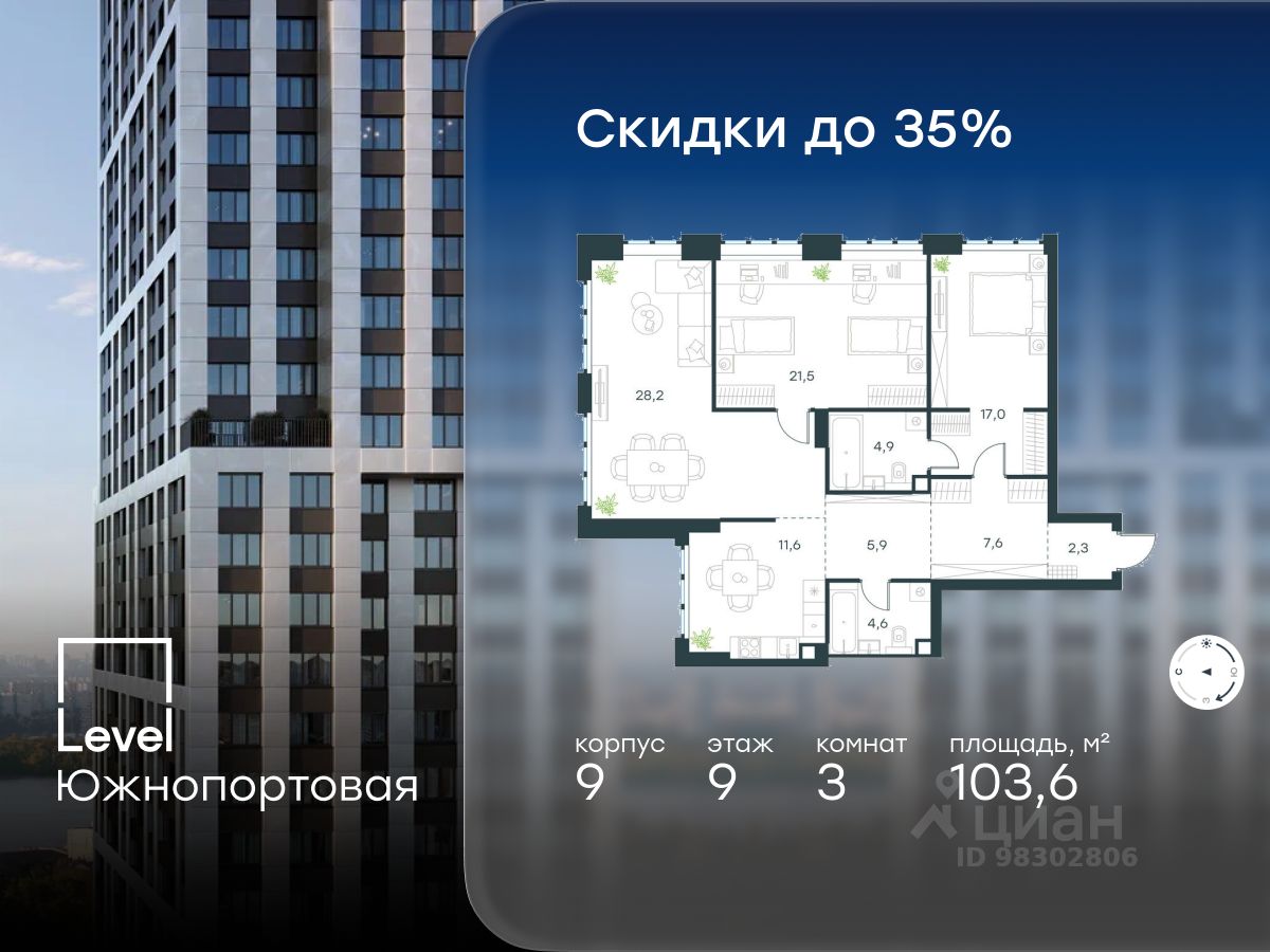 В северной части района Печатники продается 3-комнатная квартира площадью 103.60 кв.м с отделкой white box. Квартира расположена на 9 этаже 49-этажного корпуса 9 в жилом комплексе комфорт-класса Level Южнопортовая (компания Level Group/Левел групп).