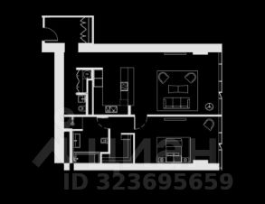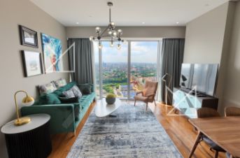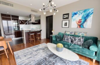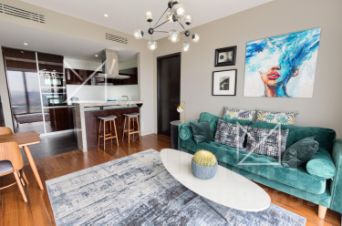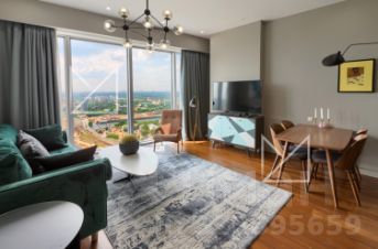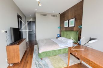 2-х комнатные апартаменты. Просторная гостиная совмещенная с кухней, одна спальня, гардеробная комната, ванная комната, два санузла.