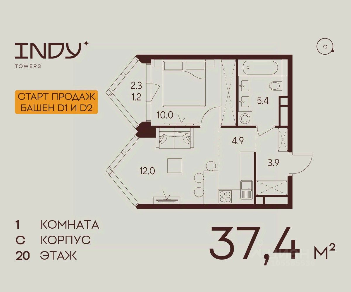 Продается уютная однокомнатная квартира на 20 этаже жилого комплекса Indy Towers. Вид из окон: во двор. Срок сдачи: 4 кв. 2026 г.