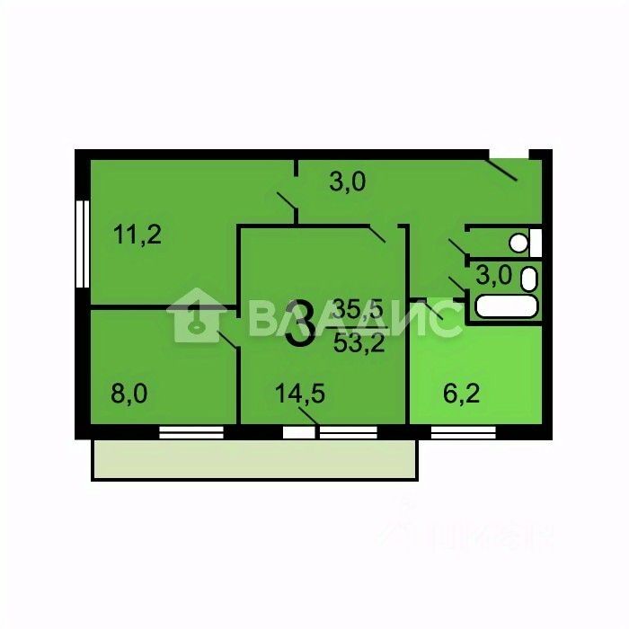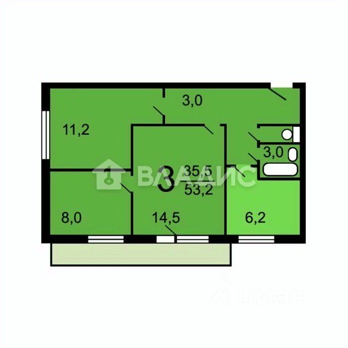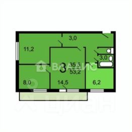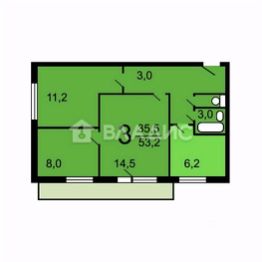 Квартира расположена на 5 этаже 9-этажного панельного дома, построенного в 1974 году. Общая площадь составляет 53,6 кв. м, из которых 35,5 кв. м — жилая площадь, а 6,2 кв. м — кухня. Высота потолков — 2,6 м.