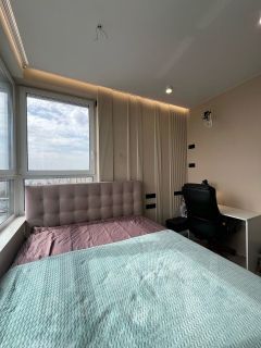 Высота потолков 2,85. Окна выходят на южную сторону. Прекрасный вид из окон за счет того, что квартира на 26 этаже.