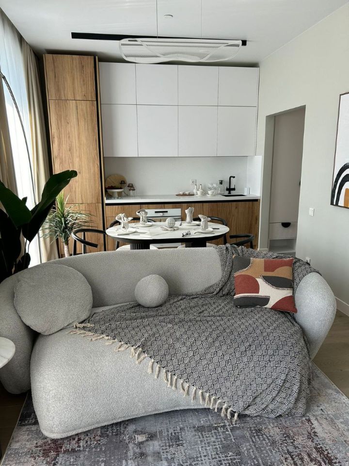 Квартира с евроремонтом и стильной мебелью. На кухне есть вся необходимая техника: холодильник, посудомоечная машина и кондиционер. В комнатах также имеется мебель, включая телевизор. В квартире два отдельных санузла, в одном из которых установлена ванна. Для вашего удобства предусмотрен интернет. Дом бизнес класса, в отличном состоянии, оснащён пассажирским и грузовым лифтами. Для автомобилистов предусмотрена подземная парковка (место можно арендовать дополнительно ), что обеспечит безопасность вашего транспорта.