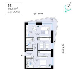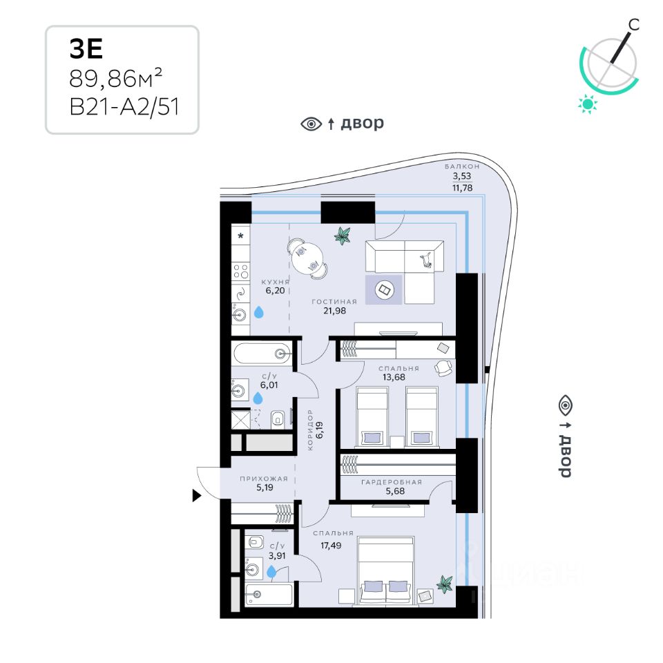В продаже — двухкомнатная квартира, общей площадью 89,86 кв. м. Квартира расположена на девятом этаже тринадцатиэтажной секции корпуса класса Адвансд в новом районе СберСити, который строит Сбер. Дом находится на второй береговой линии Москвы-реки.