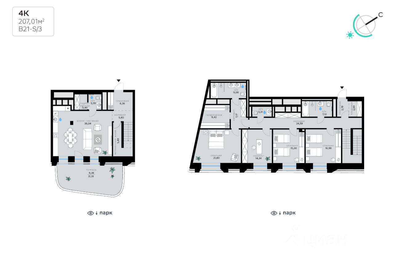 В продаже — четырехкомнатная квартира, общей площадью 207,01 кв. м. Квартира расположена на первом этаже шестиэтажной секции корпуса класса Суперб в новом районе СберСити, который строит Сбер. Дом находится на первой береговой линии Москвы-реки.