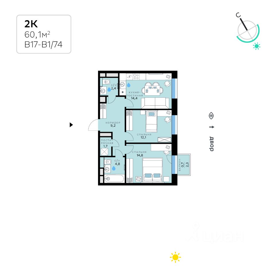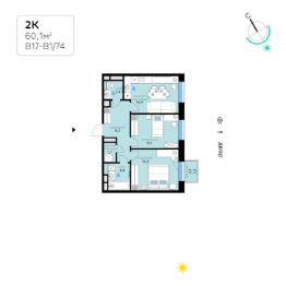 В продаже — двухкомнатная квартира с чистовой отделкой, общей площадью 60,1 кв. м. Квартира расположена на восьмом этаже шестиэтажного корпуса класса Балансд в квартале В17 нового района СберСити, который строит Сбер. Всего в доме — 102 квартиры.