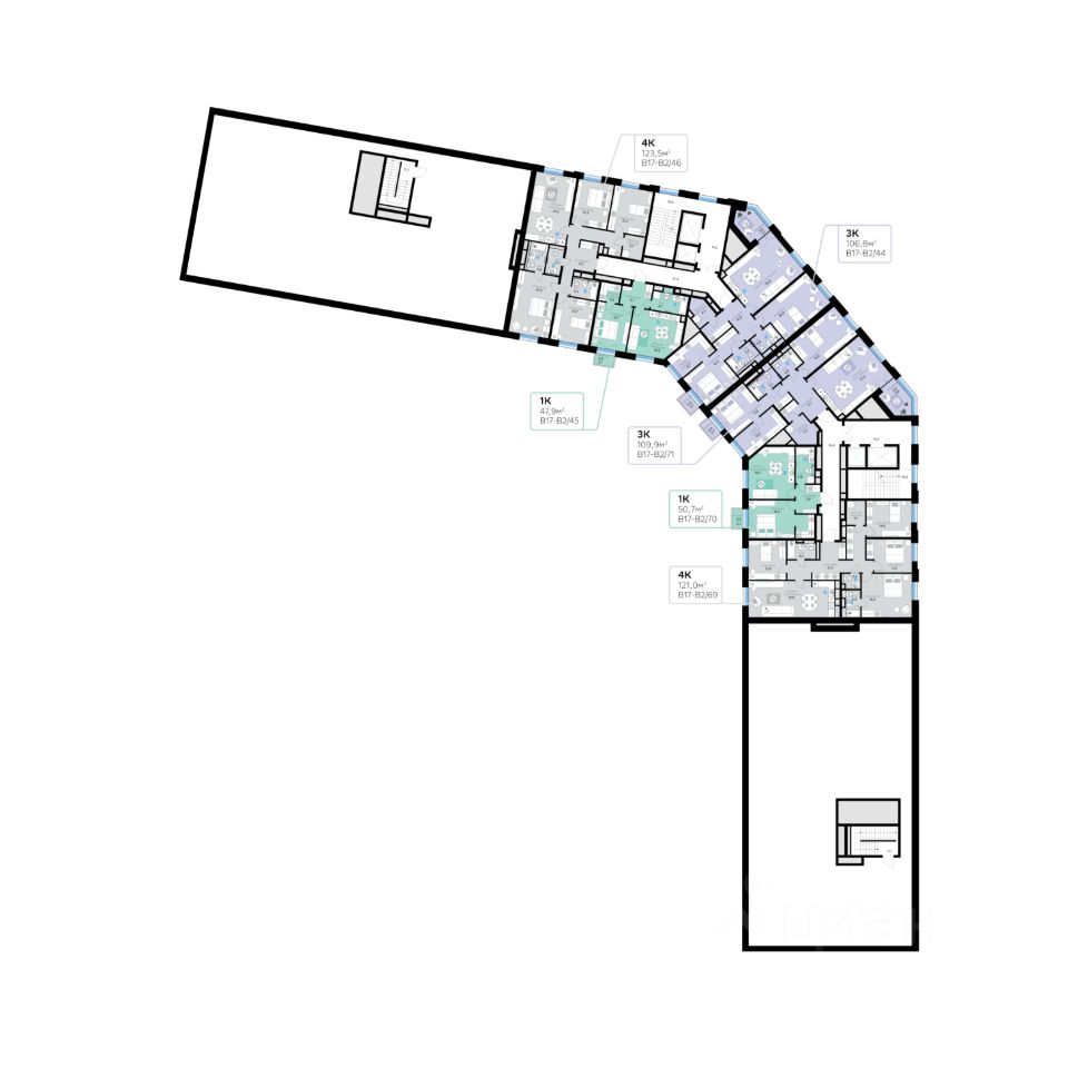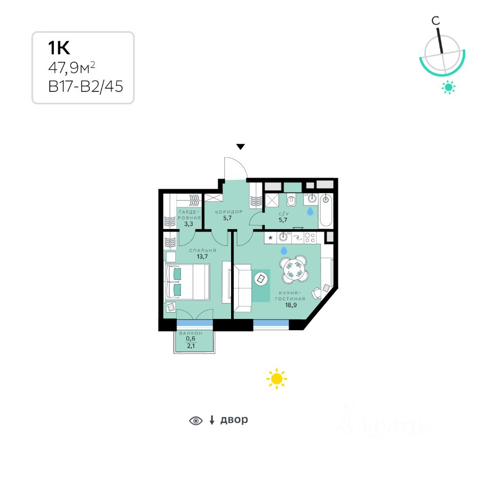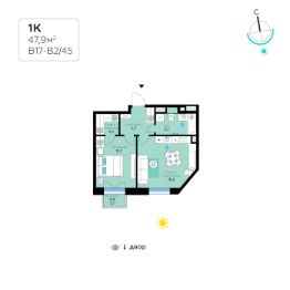 В продаже — однокомнатная квартира с чистовой отделкой, общей площадью 47,9 кв. м. Квартира расположена на седьмом этаже семиэтажного корпуса класса Балансд в квартале В17 нового района СберСити, который строит Сбер. Всего в доме — 103 квартиры.