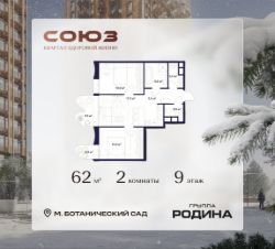 Продаётся 2-комнатная квартира площадью 62 м² на 9 этаже в Жилом Комплексе "Союз".