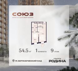 Продаётся 1-комнатная квартира площадью 54.5 м² на 9 этаже в Жилом Комплексе "Союз".