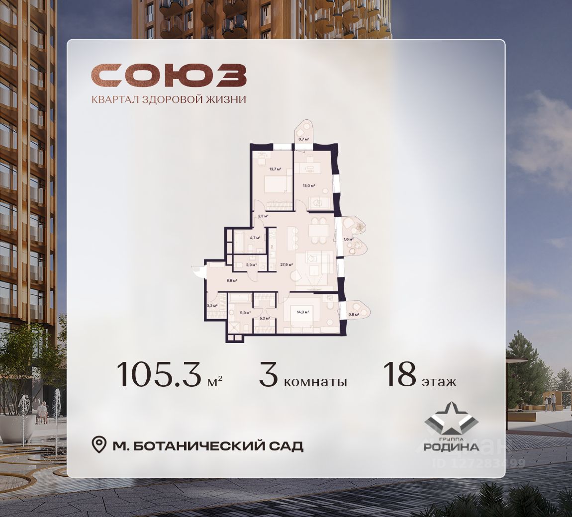 Продаётся 3-комнатная квартира площадью 105.3 м² на 18 этаже в Жилом Комплексе "Союз".