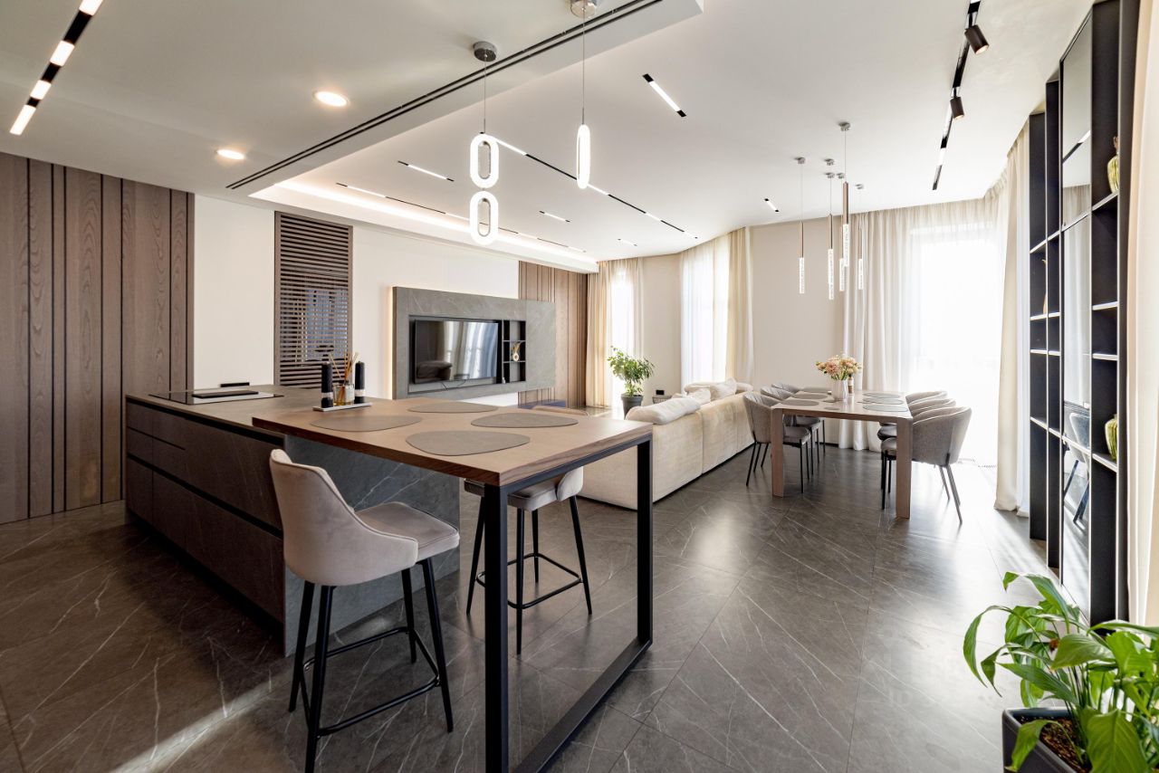 Продуманная планировка: кухня гостиная, мастер спальня, две детские спальни со своими санузлами, кабинет, гардеробная и гостевой санузел. В квартире выполнен дизайнерский ремонт из экологических качественных материалов. Красивые высокие двери, много зеркал, света и встроенных элементов. Вся мебель производства Италия. На кухне установлена вся встроенная техника: холодильник, кофемашина, микроволновая печь, духовой шкаф, варочная панель с вытяжкой, посудомоечная машина. В санузле: стиральная и сушильная машины, система по уходу за одеждой с функцией пара. В квартире установлена система приточно-вытяжной вентиляции и кондиционирования Daikin. На полу керамогранит и паркет. Теплые полы в санузлах, гостиной и коридоре.