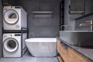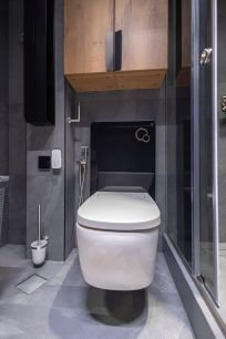 Имеется стиральная, сушильная машины, умный унитаз". Шторы на электро-карнизах, окна выходят во двор, обеспечивая тишину и спокойствие.
