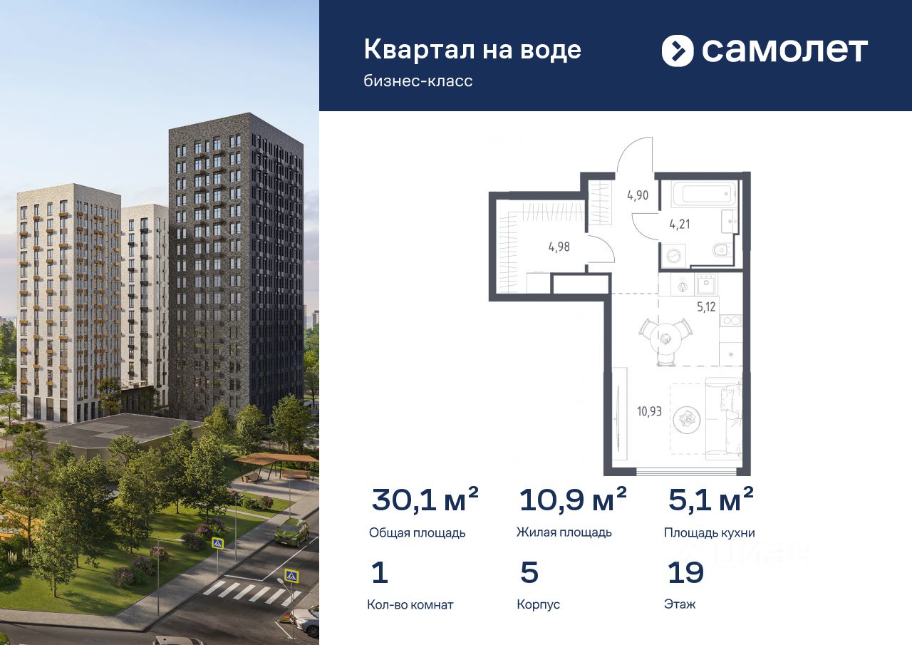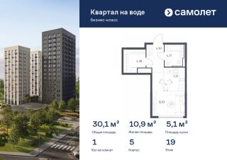 Строим кварталы для жизни с заботой о будущем. Предлагается 1-комнатная квартира бизнес-класса 30,14 кв.м в корпусе 5 на 19 этаже, в ЖК "Квартал на воде"