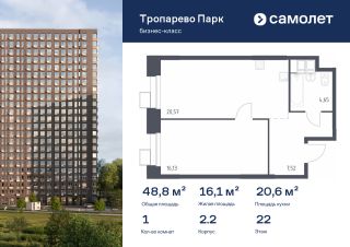 Строим кварталы для жизни с заботой о будущем. Предлагаются 1-комнатные апартаменты бизнес-класса 48,76 кв.м в корпусе 2.2 на 22 этаже, в МФК "Тропарево Парк"