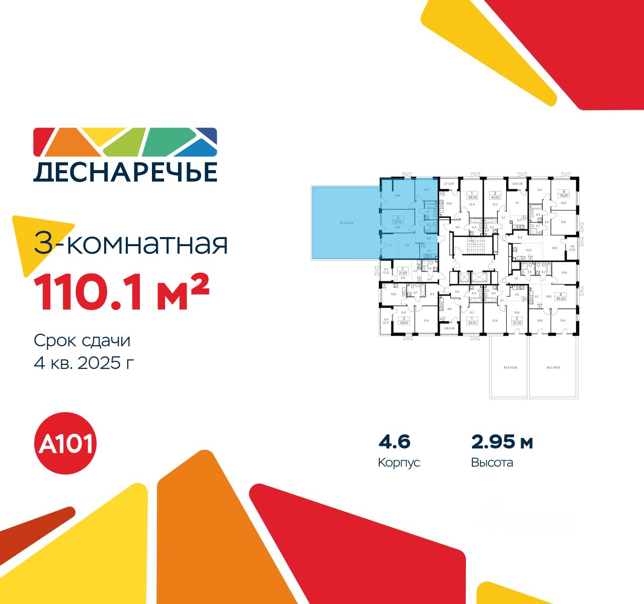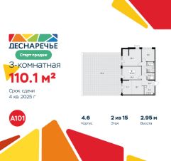 Продается трехкомнатная квартира 1312 в новостройке ЖК "Деснаречье" по адресу Москва, ТиНАО, Новомосковский АО, Десеновское С/П, Десна деревня, Москва, район Троицк, ЖК Деснаречье, к. 4.6. Общая площадь квартиры - 110.10 кв. м., этаж 2 из 15, секция 18. Тип проекта, по которому построен дом - монолит, компания-застройщик - ООО "А101". Стоимость квартиры - 26813639 Р. Срок сдачи - 4 квартал 2025.