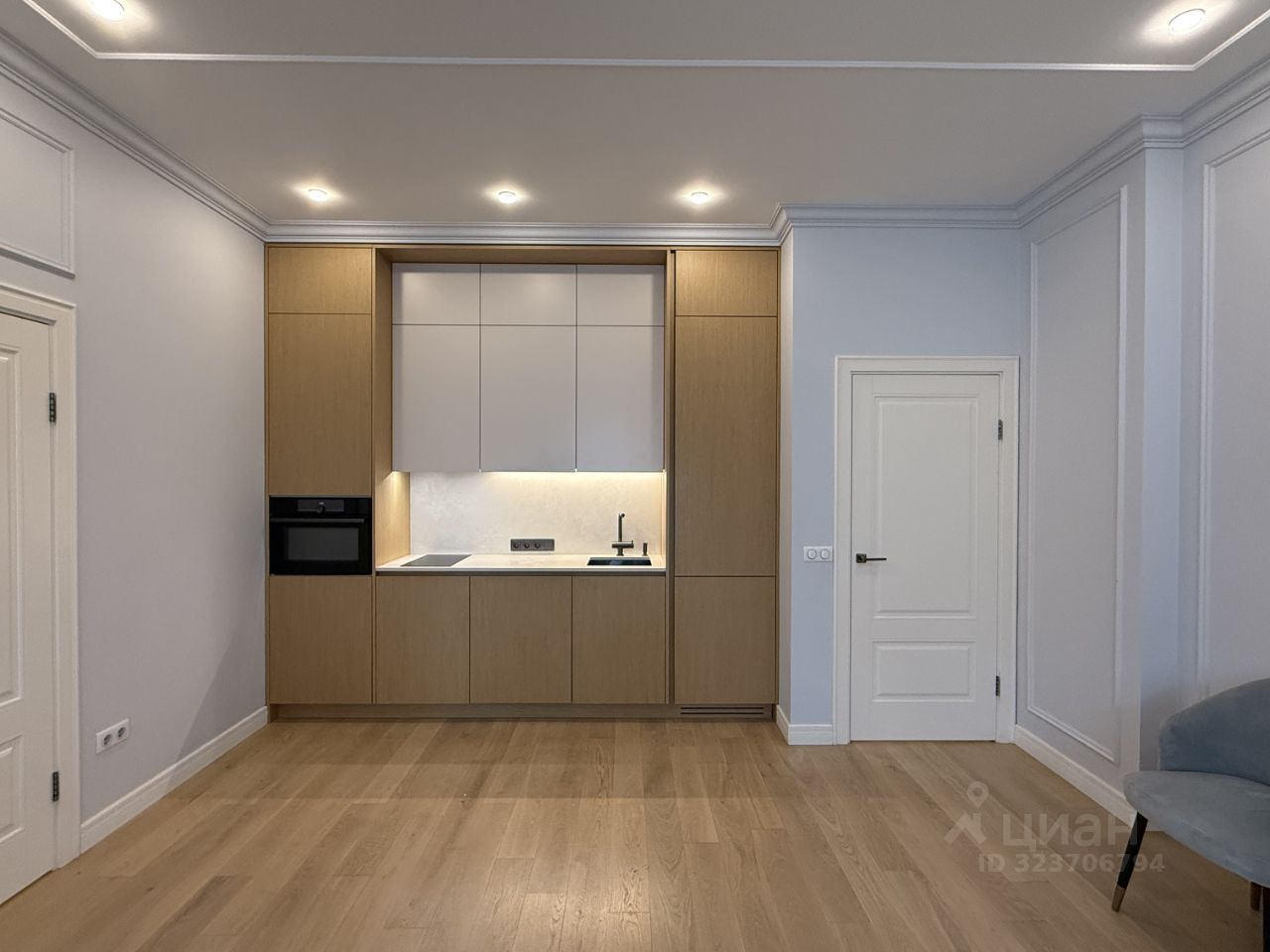 Новая встроенная мебель: шкафы, кухня со встроенной техникой: холодильник, морозильная камера, вытяжка, варочная панель, духовой шкаф-микроволновка, посудомоечная машинка.