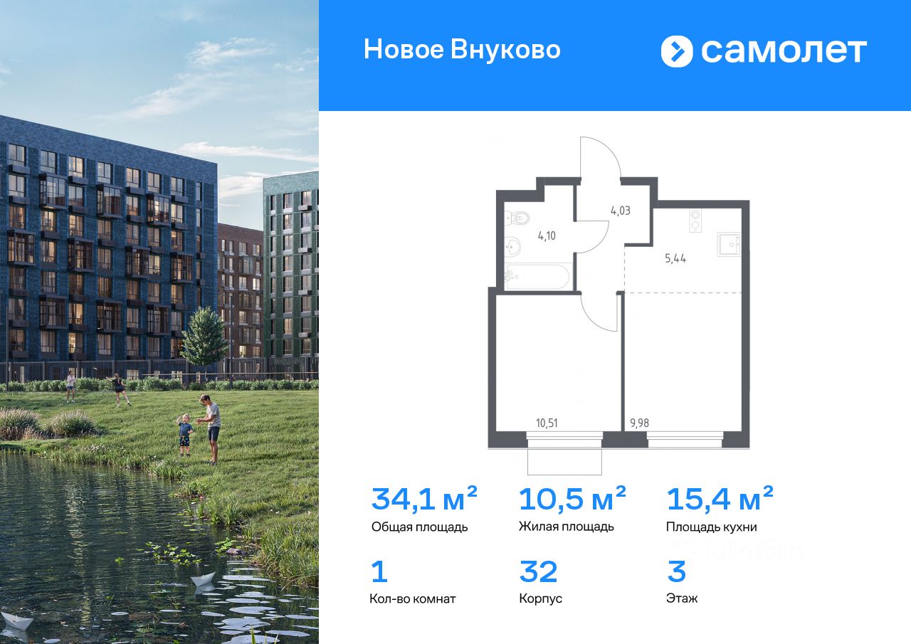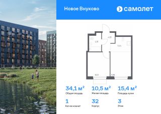 Строим кварталы для жизни с заботой о будущем. Предлагается 1-комнатная квартира комфорт-класса 34,06 кв.м в корпусе 32 на 3 этаже, в ЖК "Новое Внуково"