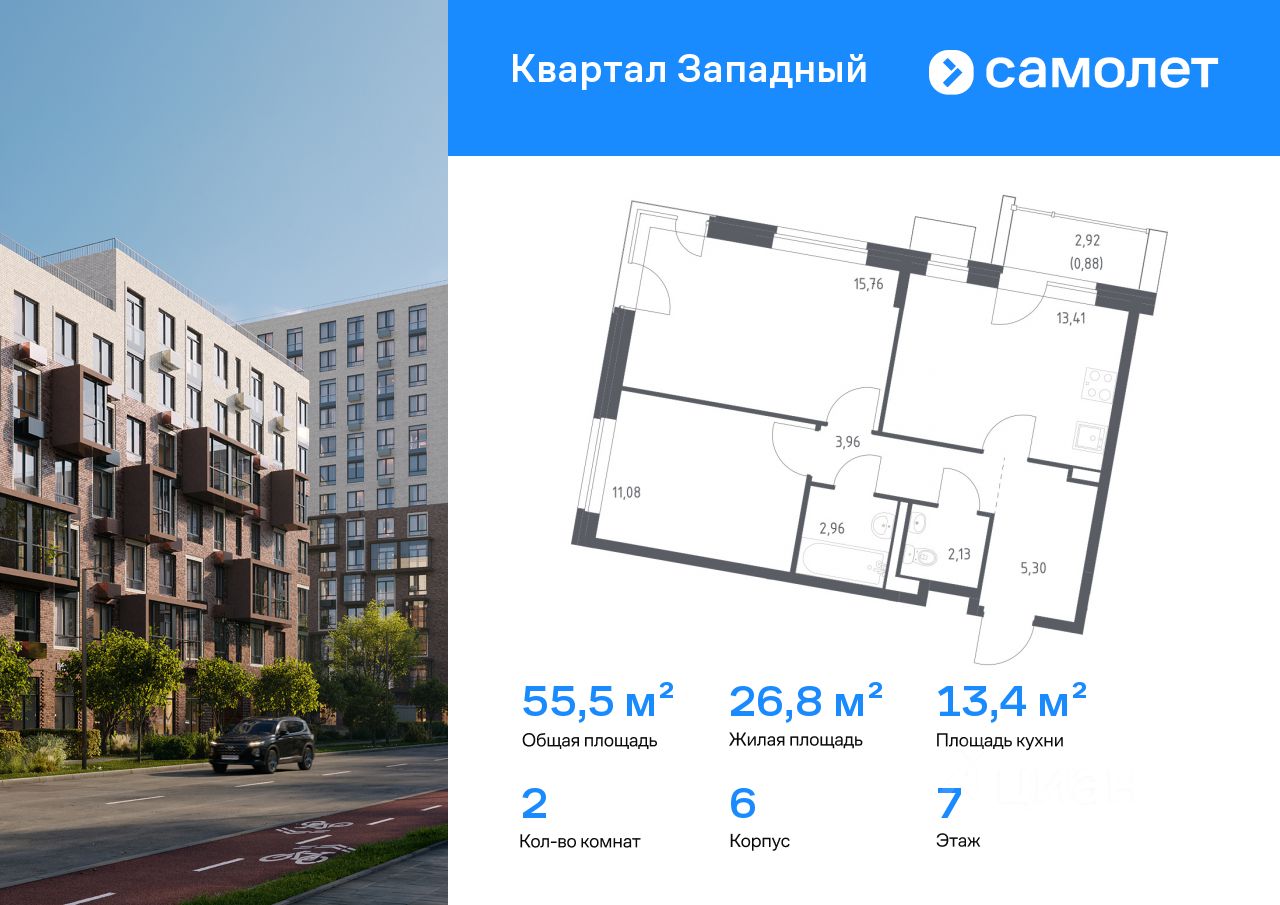 Строим кварталы для жизни с заботой о будущем. Предлагается 2-комнатная квартира комфорт-класса 55,48 кв.м в корпусе 6 на 7 этаже, в ЖК "Квартал Западный"
