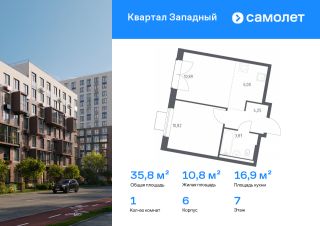 Строим кварталы для жизни с заботой о будущем. Предлагается 1-комнатная квартира комфорт-класса 35,83 кв.м в корпусе 6 на 7 этаже, в ЖК "Квартал Западный"