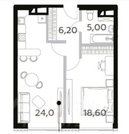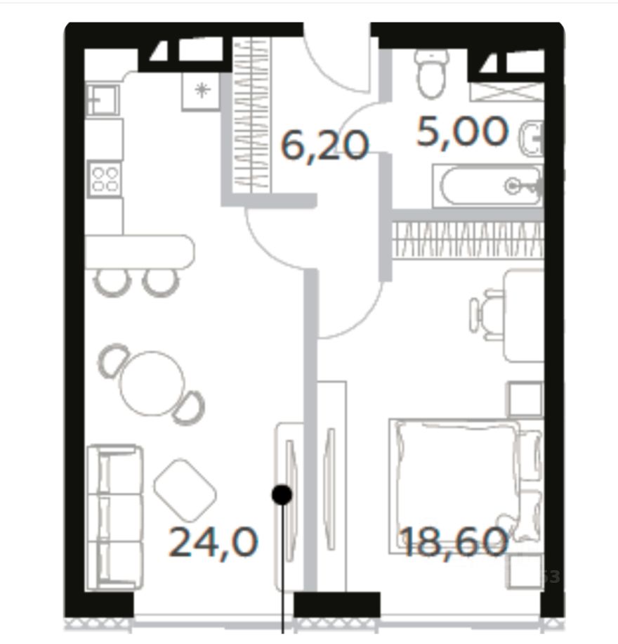 Планировкой предусмотрена просторная кухня 24,0 м2, изолированная жилая комната 18,6 м2, большой совмещённый санузел и удобная прихожая.