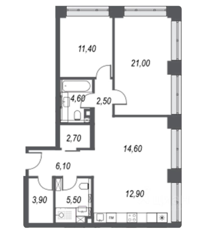 Учитывая большое пространство и количество окон, будущие собственники, при необходимости, смогут легко обустроить дополнительную комнату комфортной площади, тем самым получить полноценную трёхкомнатную квартиру.