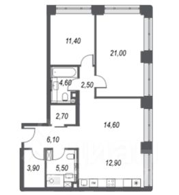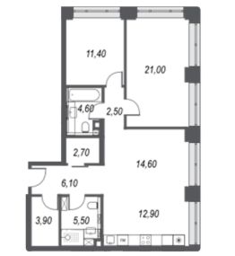 Планировкой предусмотрена просторная кухня-гостиная 27,5 м2, две изолированные жилые комнаты 11,0 и 21,0 м2, два полноценых санузла (с душевой и ванной комнатой), два вспомогательных помещения (под гардеробную и постирочную например).