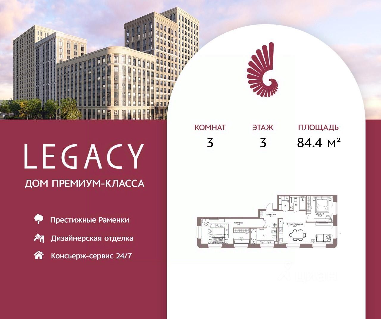 Светлая квартира общей площадью 83 м2 на 4-м этаже премиального жилого комплекса Legacy, расположенного в прекрасном зеленом районе Раменки.