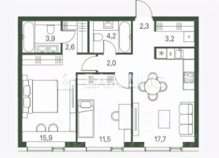 Изолированные комнаты: 15,9 + 11,5 кв.м. Большая кухня - гостиная - 17,7 кв.м !