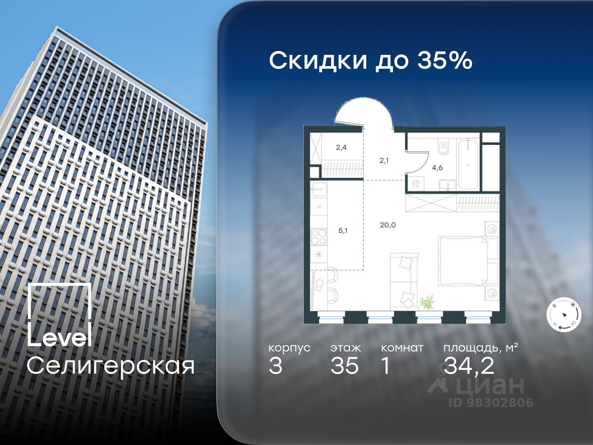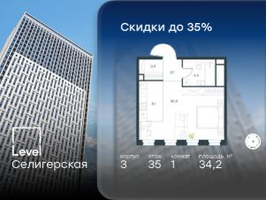 В жилом квартале, расположенном в южной части района Западное Дегунино, продаётся 1-комнатная квартира площадью 34.20 кв.м без отделки. Квартира расположена на 35 этаже 40-этажного корпуса 3 в жилом комплексе комфорт-класса Level Селигерская (компания Level Group/Левел групп).