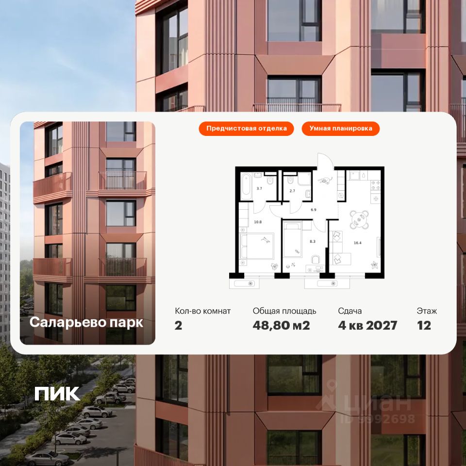 Продаётся 2-комн. квартира площадью 48,8 кв.м на 12 этаже 22 этажного дома (Корпус 57.3, Секция 3) проекта ПИК Саларьево парк. Светлый просторный подъезд на уровне земли, функциональная планировка, большие окна, предчистовая отделка.