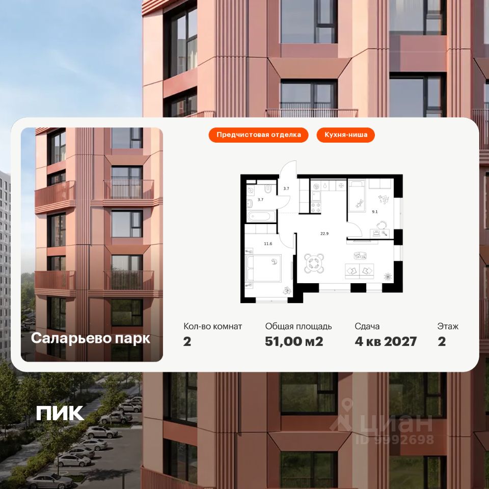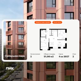 Продаётся 2-комн. квартира площадью 51 кв.м на 2 этаже 16 этажного дома (Корпус 57.1, Секция 1) проекта ПИК Саларьево парк. Светлый просторный подъезд на уровне земли, функциональная планировка, большие окна, предчистовая отделка.