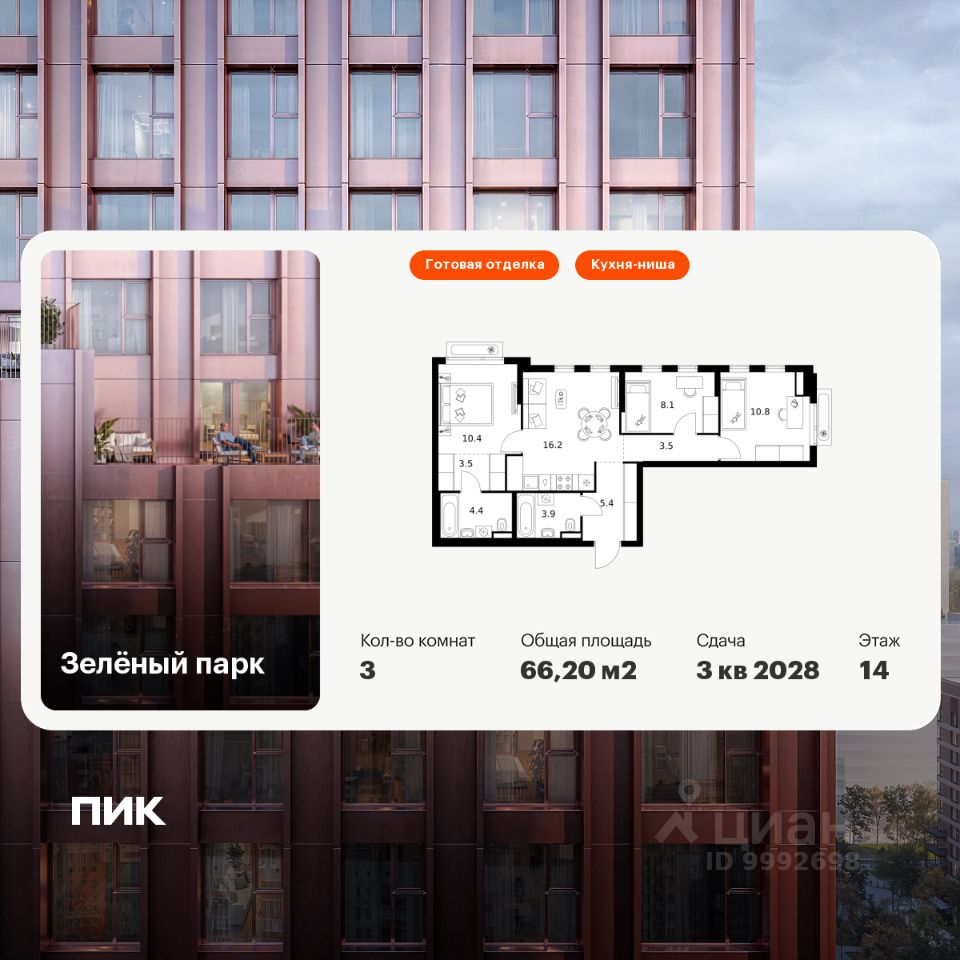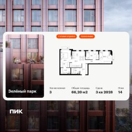 Продаётся 3-комн. квартира площадью 66,2 кв.м на 14 этаже 21 этажного дома (Корпус 5.2, Секция 1) проекта ПИК Зелёный парк. Светлый просторный подъезд на уровне земли, функциональная планировка, большие окна, c отделкой.