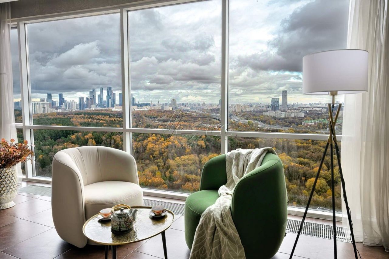 Главное преимущество квартиры - панорамное остекление с завораживающими видами на Матвеевский лес, Долину реки Сетунь, Москва-Сити, Парк Победы, МГУ. Вся Москва - буквально как на ладони!