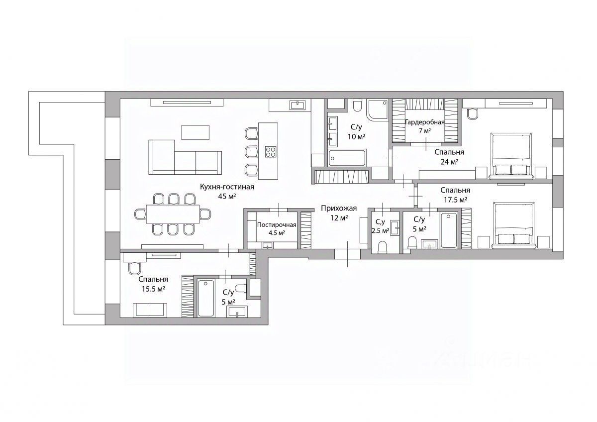 Свободная планировка и правильная геометрия позволяют максимально эффективно распорядиться пространством. Можно спланировать эффектную зону кухни-гостиной-столовой (60 кв.м.), 3 спальни (мастер-спальня 24 кв.м., гостевая спальня 17,5 кв.м., кабинет/детская 15,5 кв.м.), 4 с/у и даже выделить постирочную.