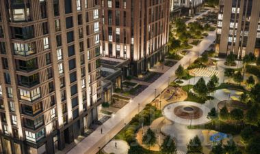 Комплекс напоминает кварталы Манхэттена: изящные, строгие линии, каменная и кирпичная отделка, цветовая гамма в натуральных песочных оттенках.