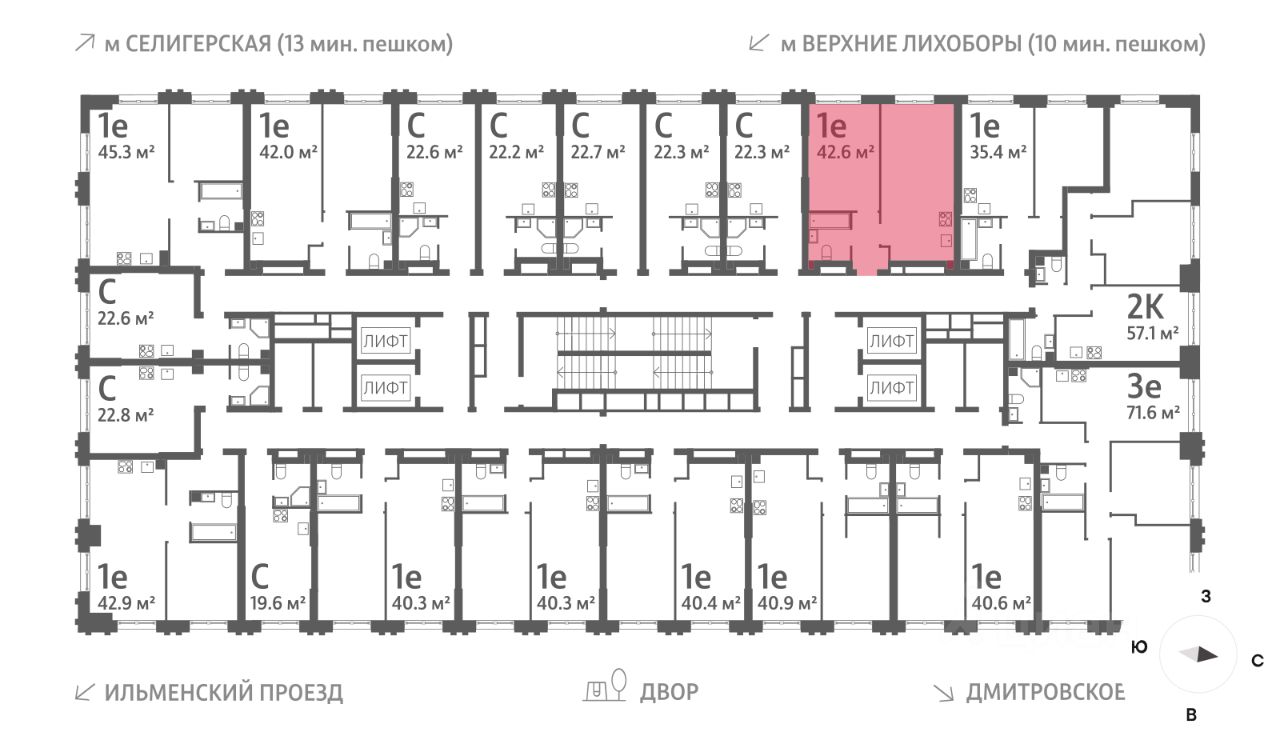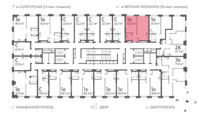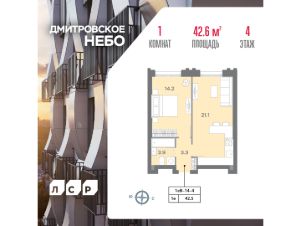 Продается 1-комнатная квартира общей площадью 42.6 кв. метров на 4 этаже жилого комплекса Дмитровское небо. Комплекс возводится в Северном административном округе в районе Западное Дегунино в Ильменском проезде, в 5 минутах ходьбы от метро "Верхние Лихоборы", а автомобилисты могут за пару минут выехать на Ильменский проезд и по нему добраться до Дмитровского шоссе.