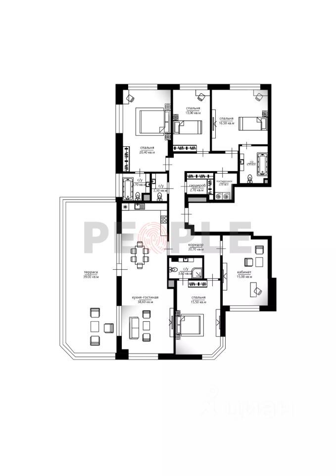 — 4 спальни (в том числе мастер-спальня с санузлом)