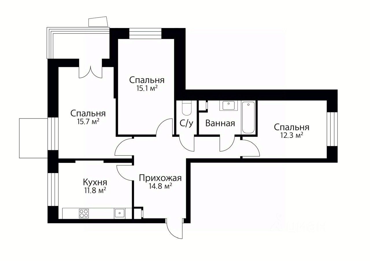 - комнаты 15,7 кв.м., 15,1 кв.м., 12,3 кв.м.;