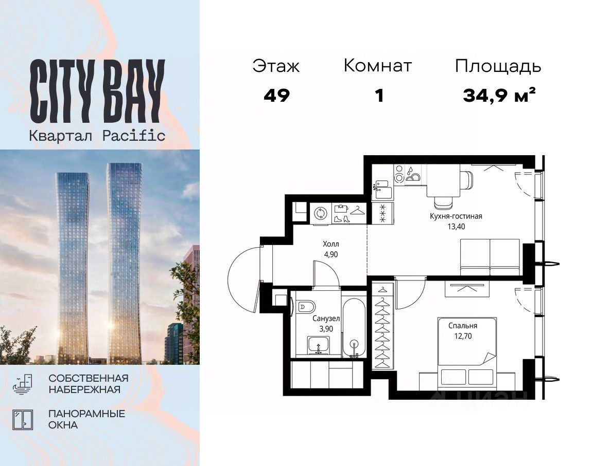 Продаётся 1-комнатная квартира общей площадью 34.90 м² без отделки в ЖК City Вау, квартале Pacific, на 49-м этаже 59 этажного дома.