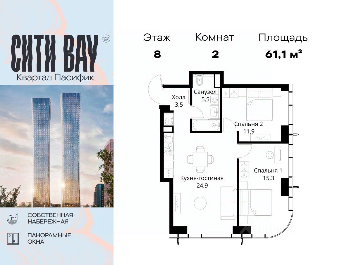 Продаётся 2-комнатная квартира общей площадью 61.10 м² без отделки в ЖК Сити Бэй, квартале Пасифик, на 8-м этаже 59 этажного дома.