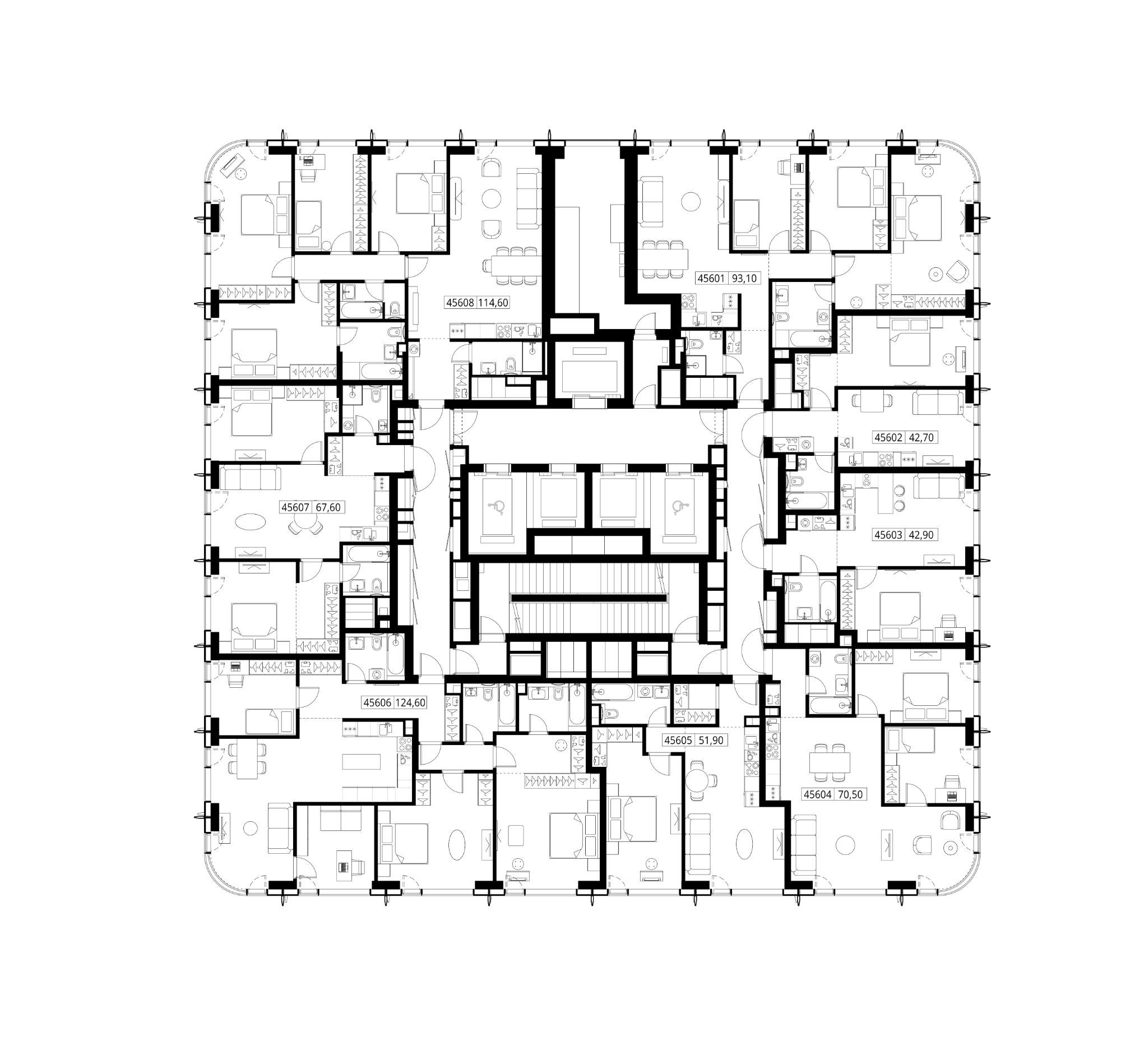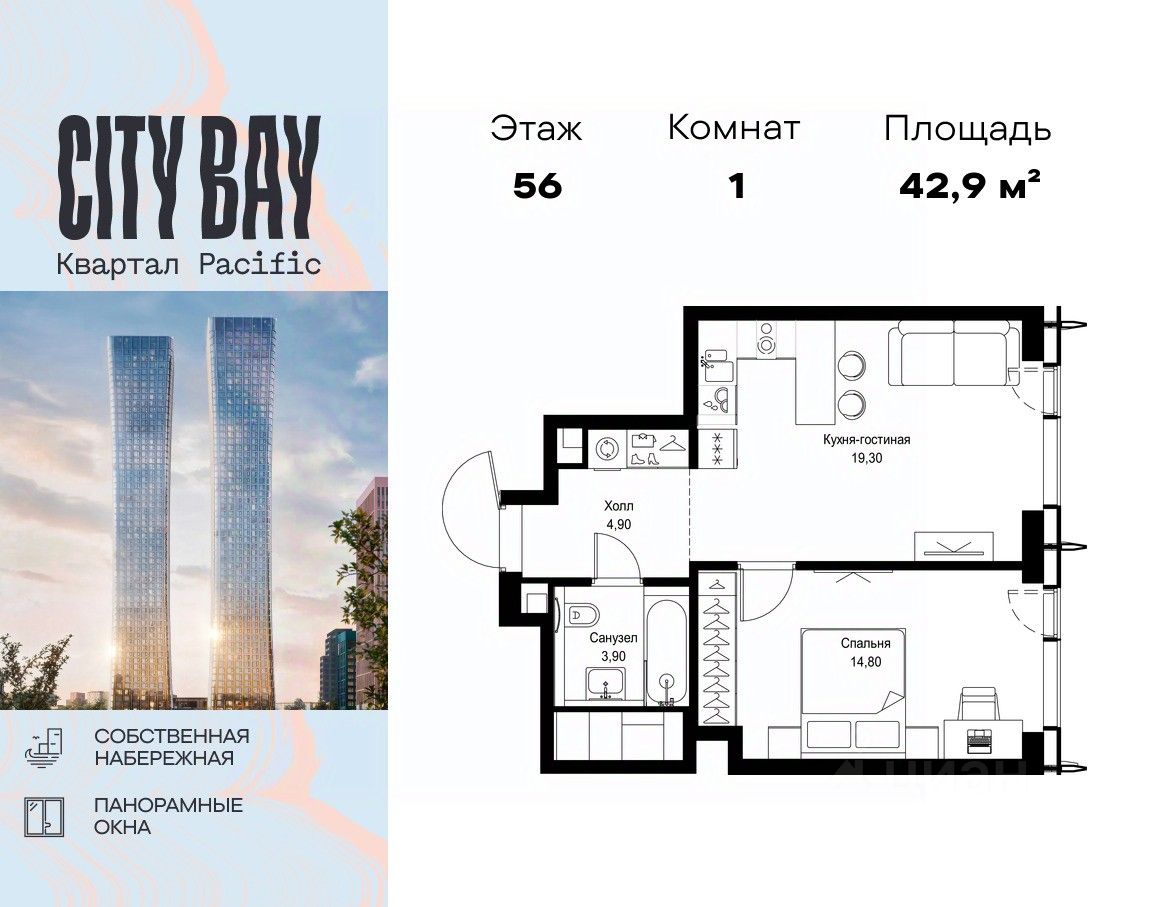 Продаётся 1-комнатная квартира общей площадью 42.90 м² без отделки в ЖК City Вау, квартале Pacific, на 56-м этаже 58 этажного дома.