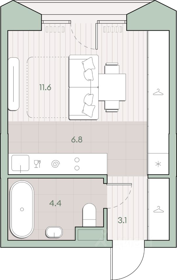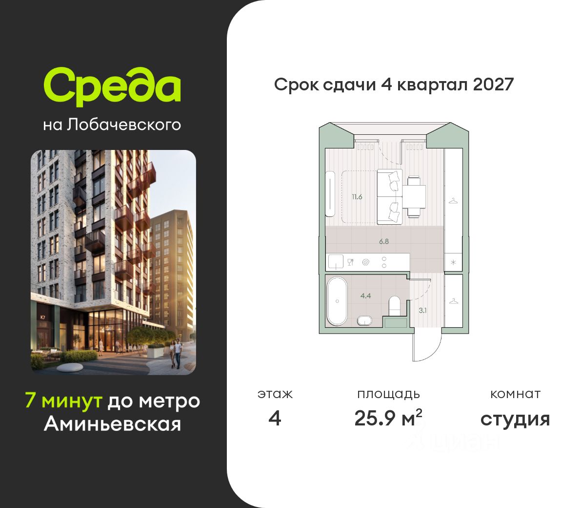 Продаётся студия общей площадью 25.9 кв.м. без отделки. Квартира расположена на 4 этаже корпуса 5.6 в жилом комплексе бизнес-класса "Среда на Лобачевского" в пешей доступности от метро "Аминьевская".