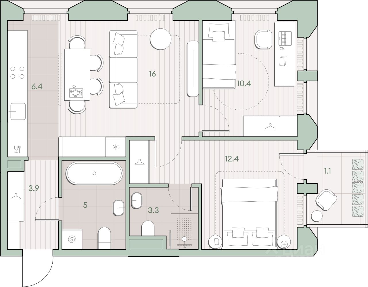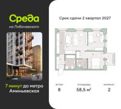 Продаётся 2-комнатная квартира общей площадью 58.5 кв.м. с отделкой white box. Квартира расположена на 8 этаже корпуса 5.1 в жилом комплексе бизнес-класса "Среда на Лобачевского" в пешей доступности от метро "Аминьевская".